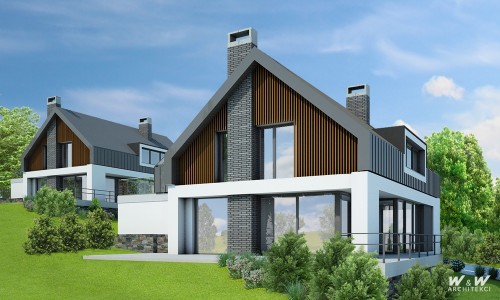 Projekt zespołu dwóch nowoczesnych rezydencji zlokalizowanych na sąsiadujących działkach.