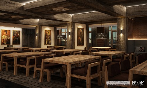 Wnętrze sali konsumpcyjnej z antresolą karczmy regionalnej w Beskidzie Śląskim.