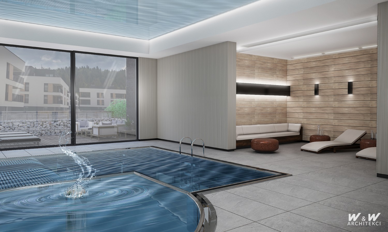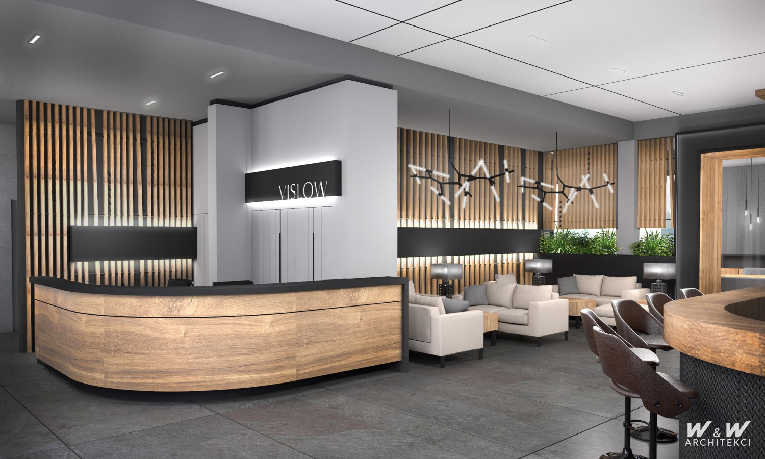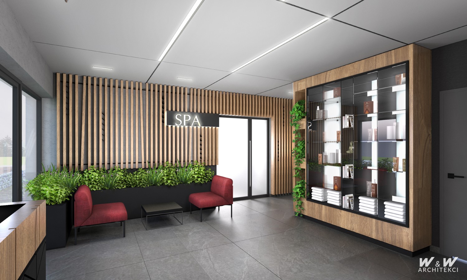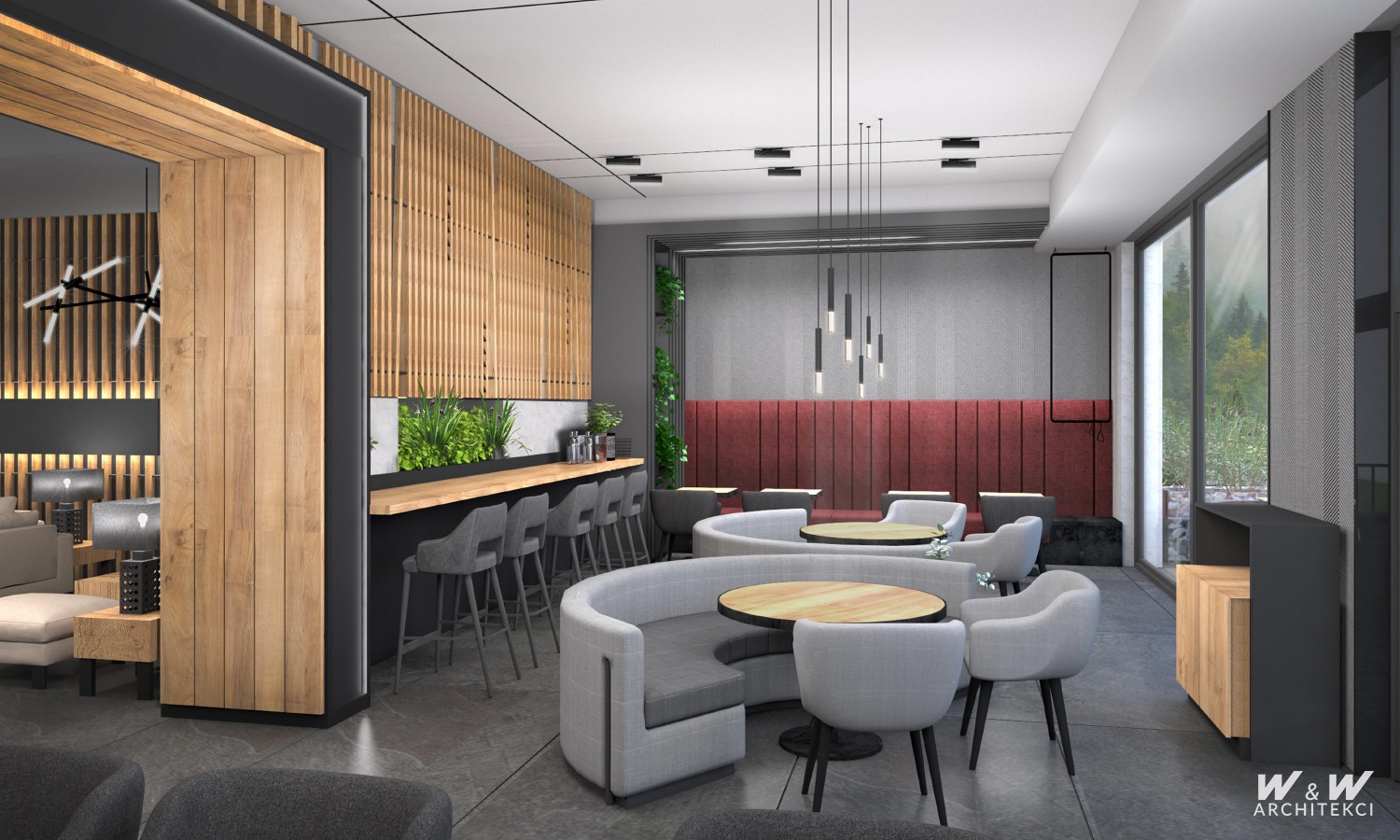 Projekt wnętrz przestrzeni rekreacyjnej nowopowstałego resortu wypoczynkowego.