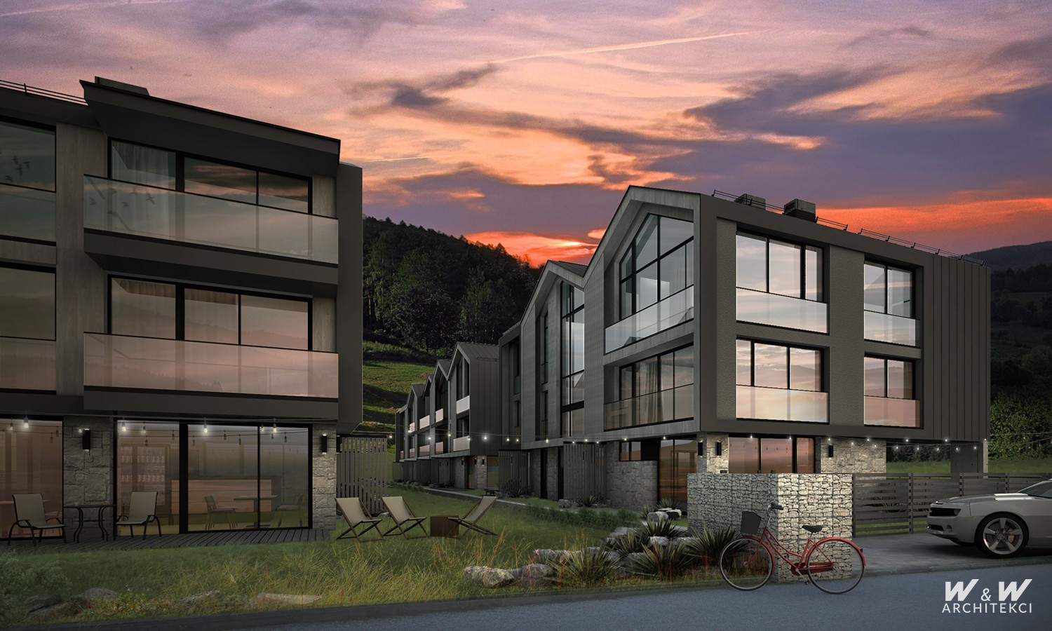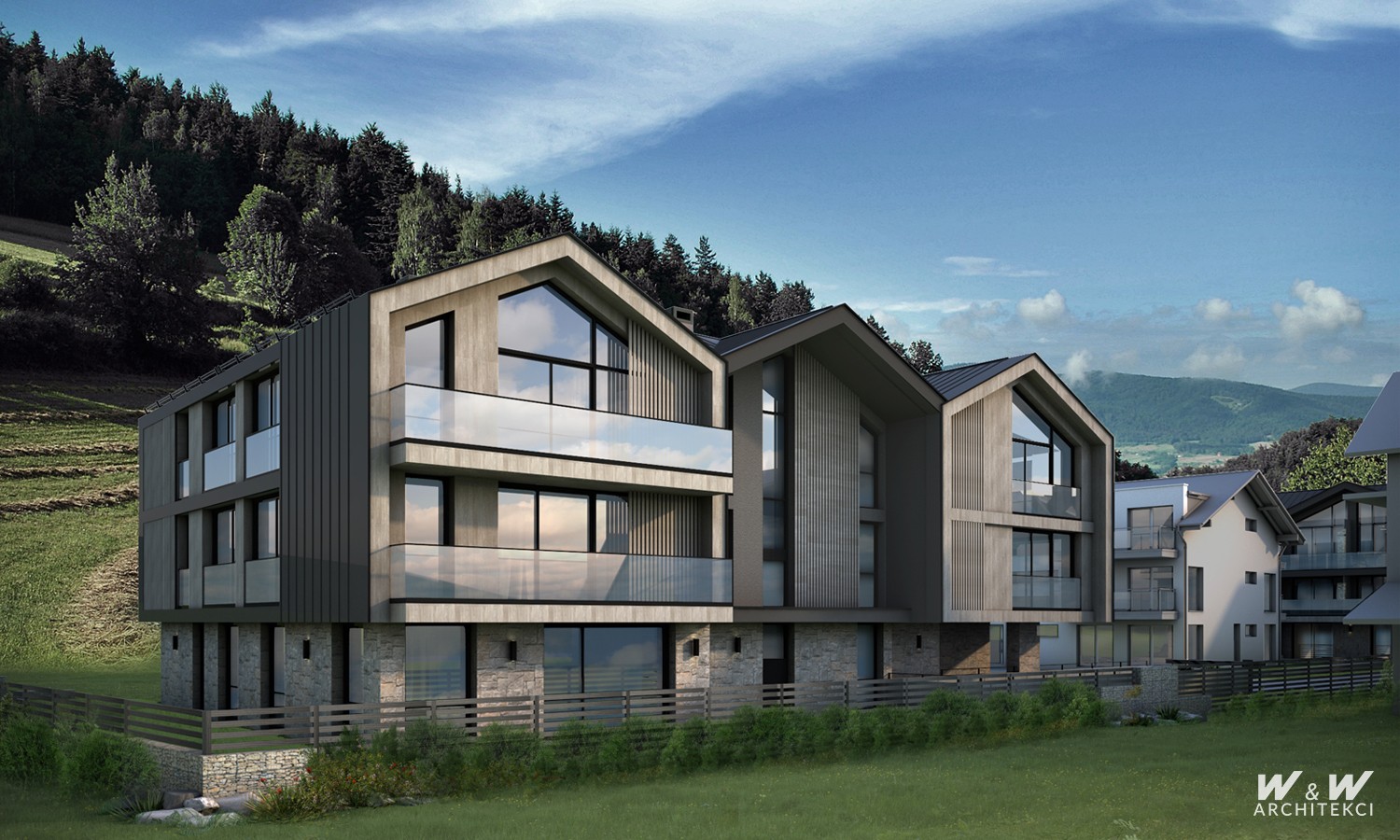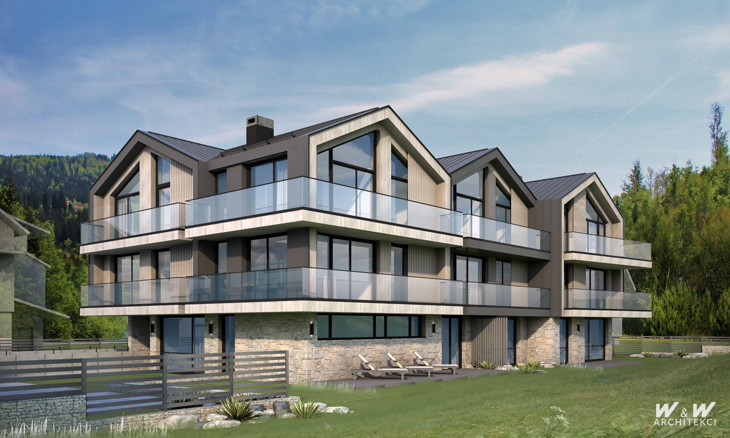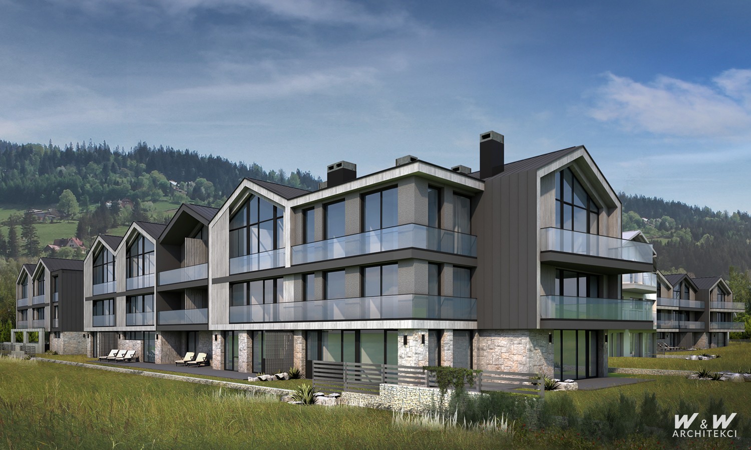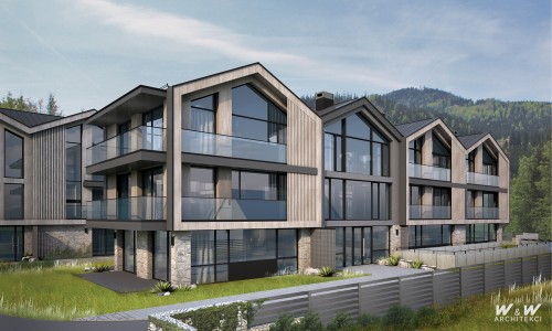 Budynki zaprojektowano na rzutach prostokąta maksymalizując powierzchnię zabudowy i układ funkcjonalny, równocześnie minimalizując koszty realizacji z uwagi na prostotę konstrukcji. Kubatura budynków ukształtowana na systemie modularnych segmentów przekrytych powtarzalnymi dwuspadowymi dachami z przeszklonymi szczytami umożliwia uzyskanie wysokich, świetnie doświetlonych lokali na najwyższej kondygnacji budynku. Lokale niższych kondygnacji posiadają okna od posadzki, otwierając wnętrza na krajobrazy górskie.