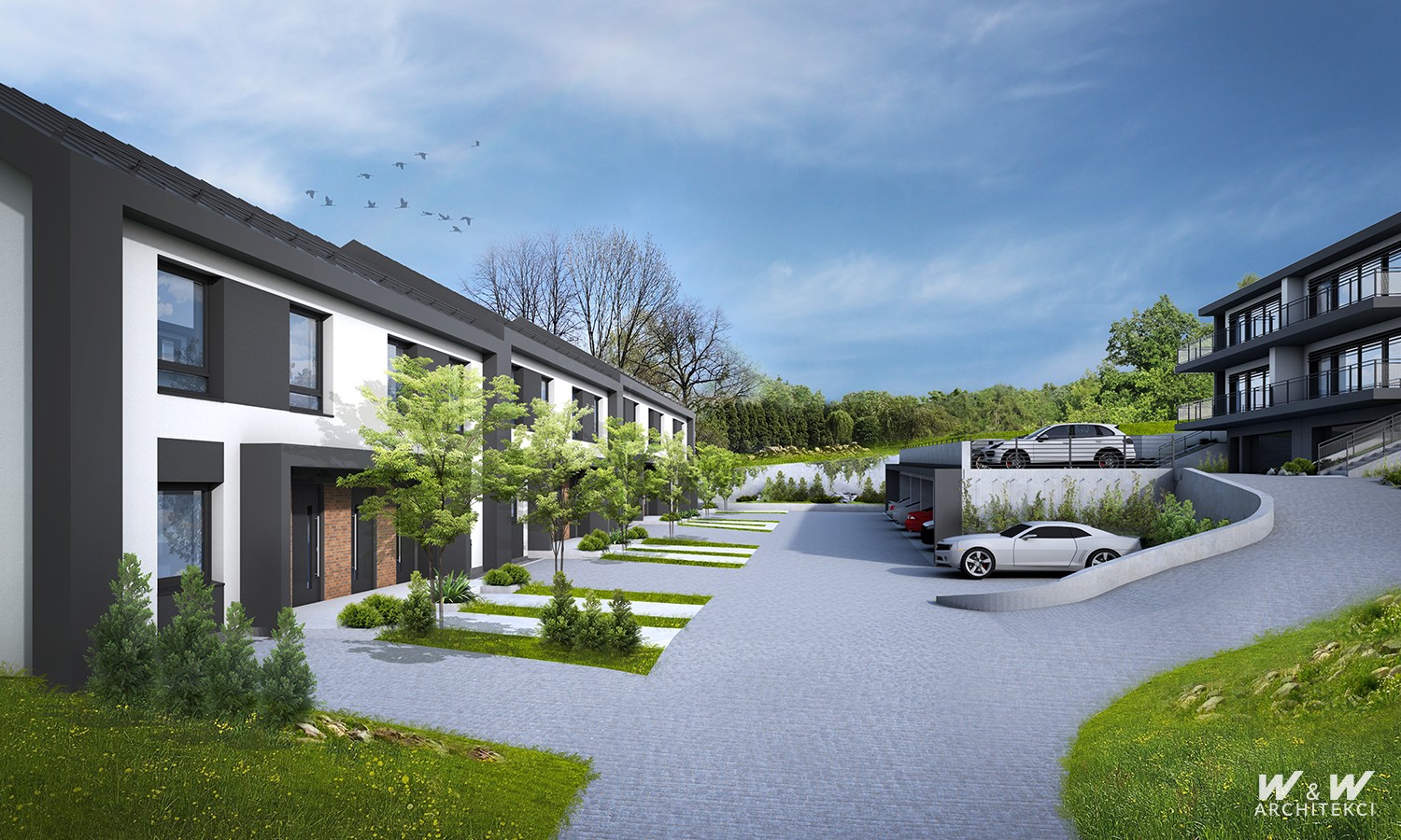 Lokale na parterze posiadają od strony południowej tarasy na gruncie, a lokale na piętrze tarasy częściowo nadwieszone.