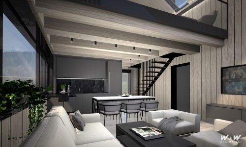 Klimatyczne wnętrze domu wypoczynkowego utrzymane w minimalistycznym stylu.