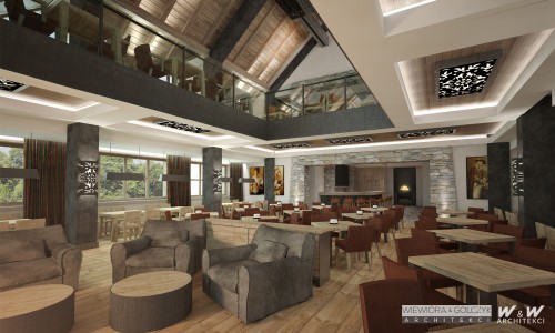 Wnętrze sali konsumpcyjnej z antresolą karczmy regionalnej w Beskidzie Śląskim.