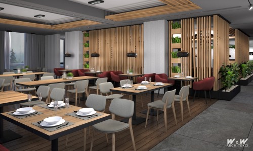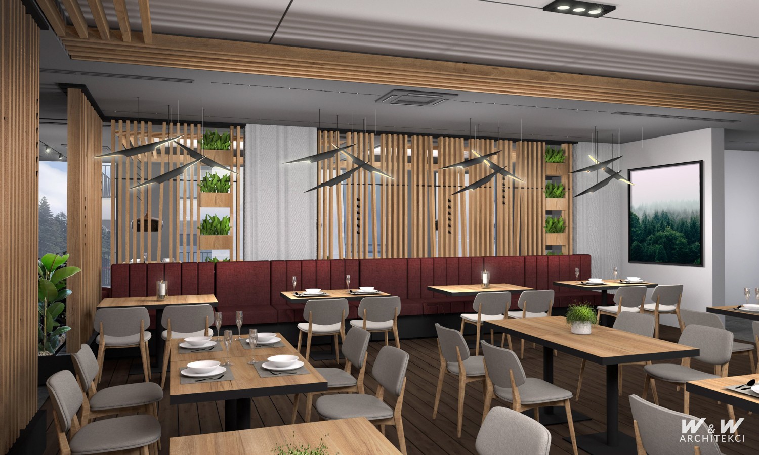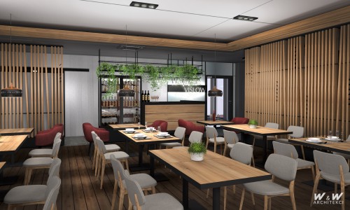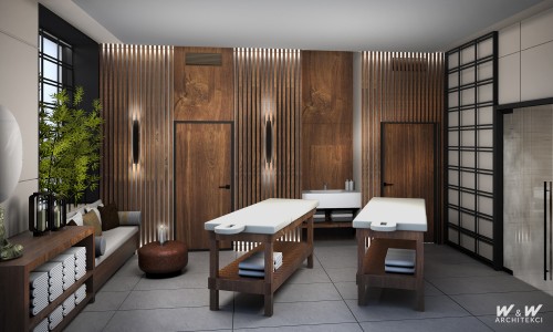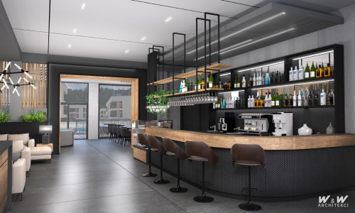 Projekt wnętrz przestrzeni rekreacyjnej nowopowstałego resortu wypoczynkowego.