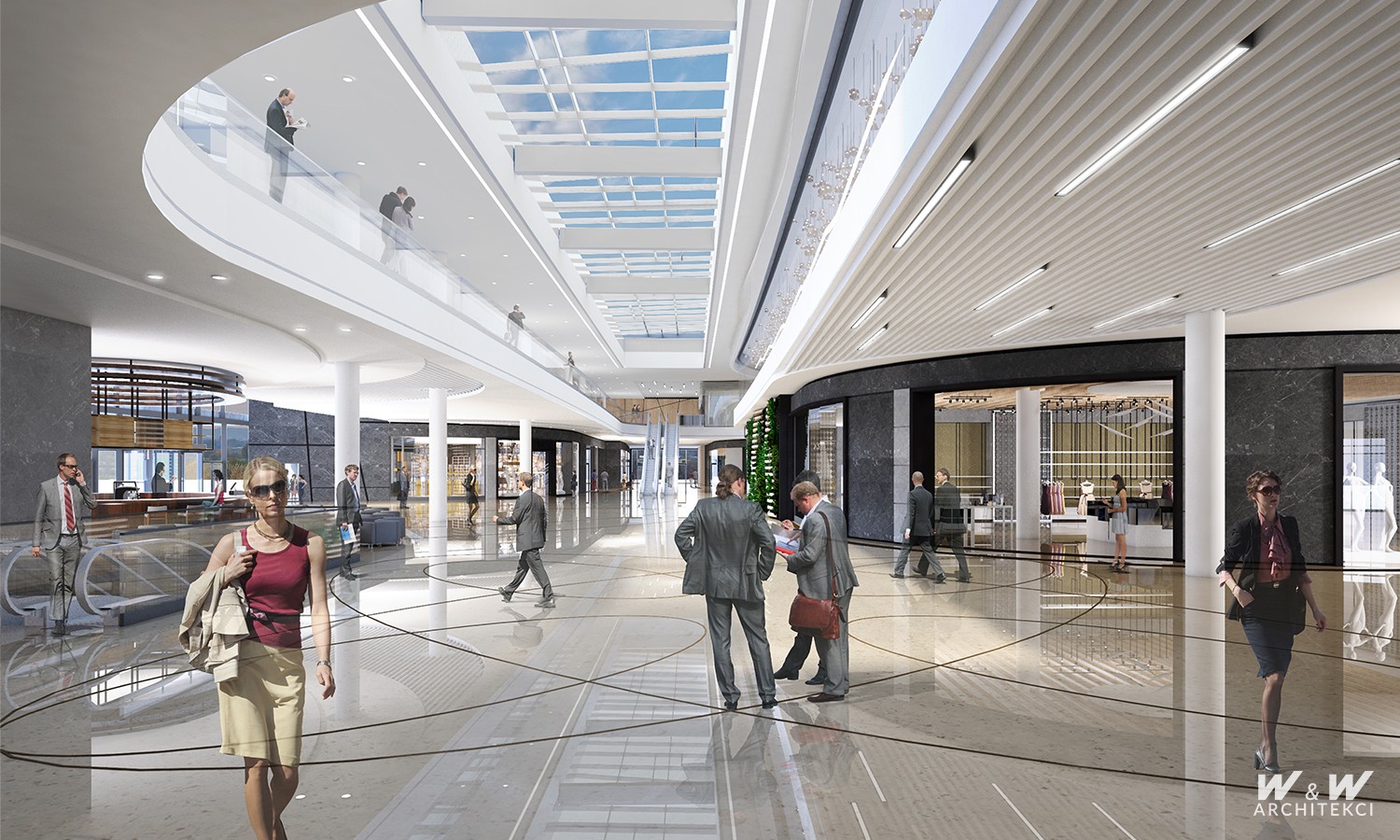 Wnętrza pasaży usługowo-handlowych wielofunkcyjnego kompleksu usługowego złożonego z trzech segmentów.