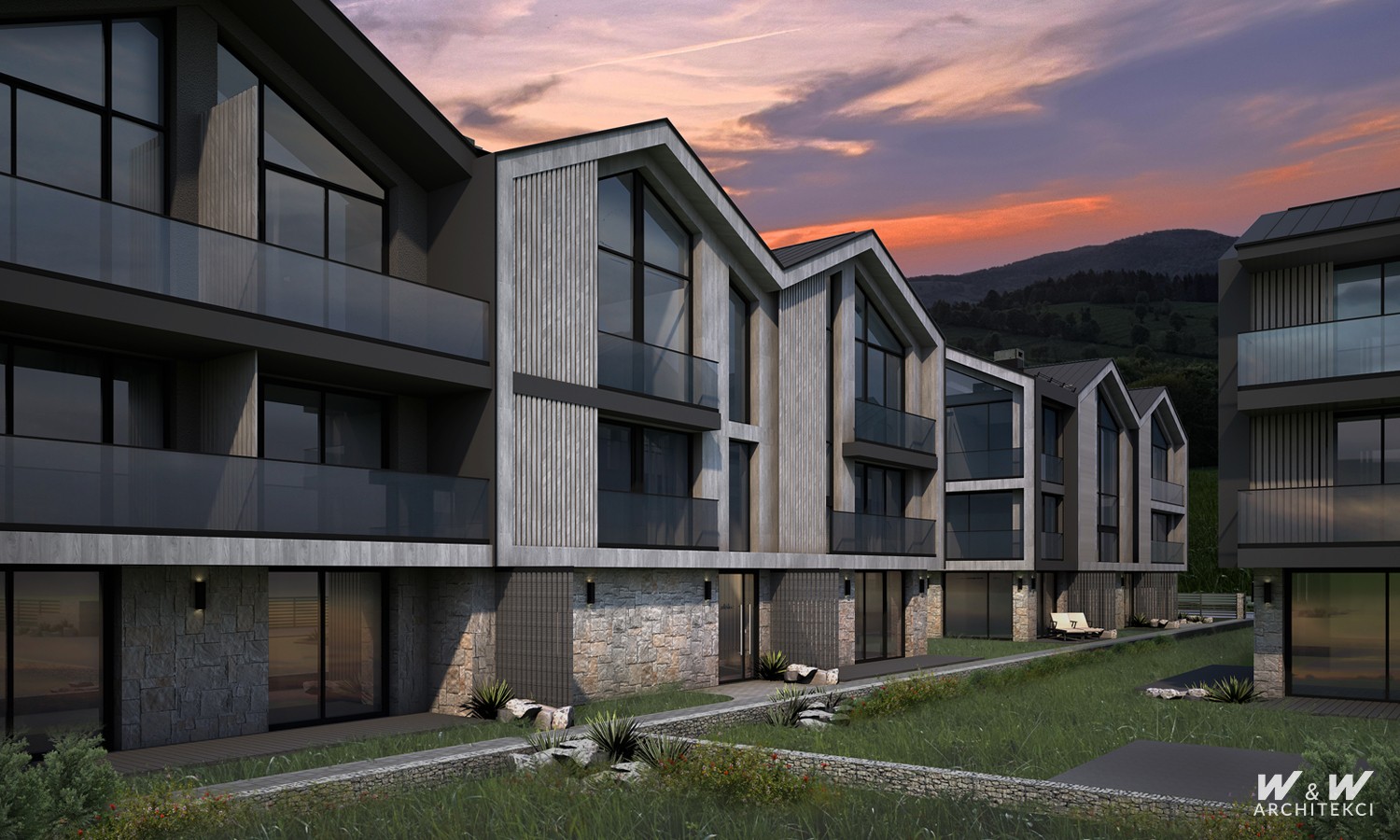 Budynki zaprojektowano na rzutach prostokąta maksymalizując powierzchnię zabudowy i układ funkcjonalny, równocześnie minimalizując koszty realizacji z uwagi na prostotę konstrukcji. Kubatura budynków ukształtowana na systemie modularnych segmentów przekrytych powtarzalnymi dwuspadowymi dachami z przeszklonymi szczytami umożliwia uzyskanie wysokich, świetnie doświetlonych lokali na najwyższej kondygnacji budynku. Lokale niższych kondygnacji posiadają okna od posadzki, otwierając wnętrza na krajobrazy górskie.