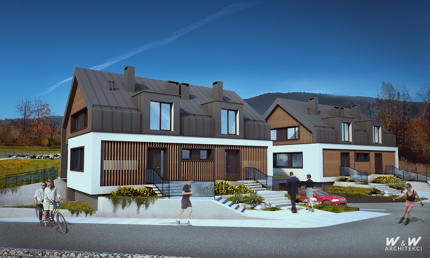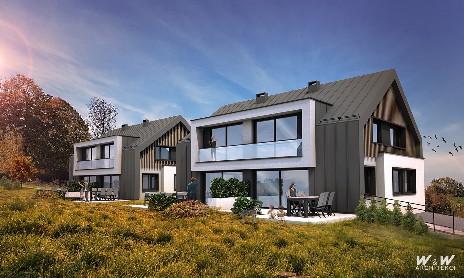 Projekt koncepcyjny trzech budynków jednorodzinnych - dwóch w zabudowie bliźniaczej oraz jednego indywidualnego.