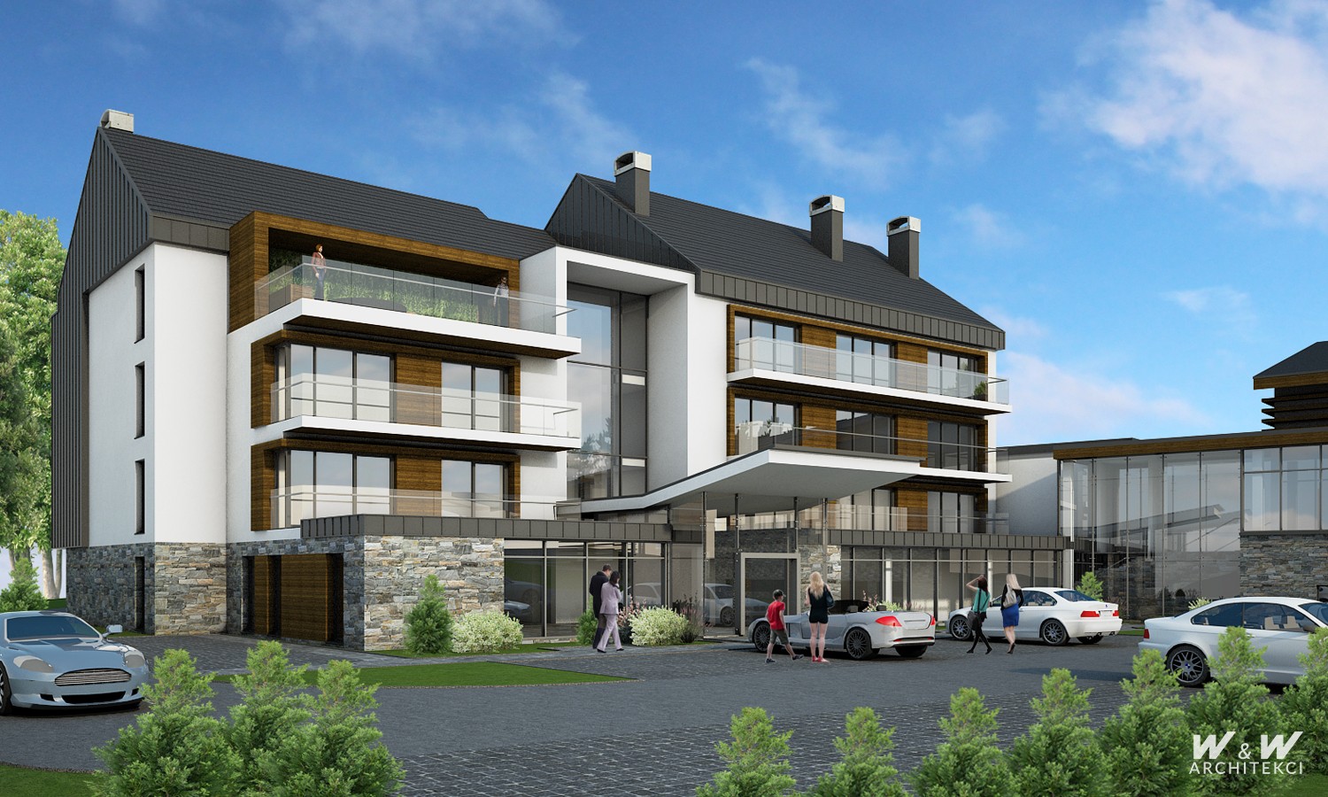 Koncepcja zespołu hotelowego z basenem, spa i salą squash.
